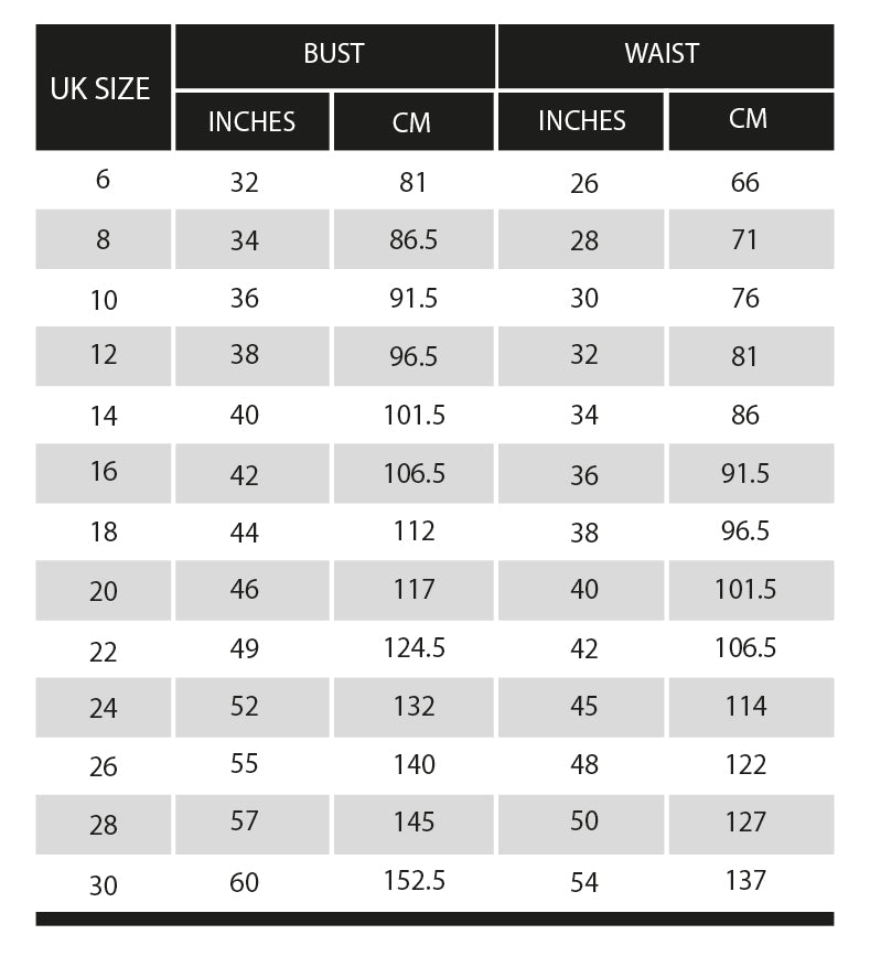 For example - If you have a 40” bust and 35” waist then order a size 14 as we make the dress approx 2” bigger than your bust.