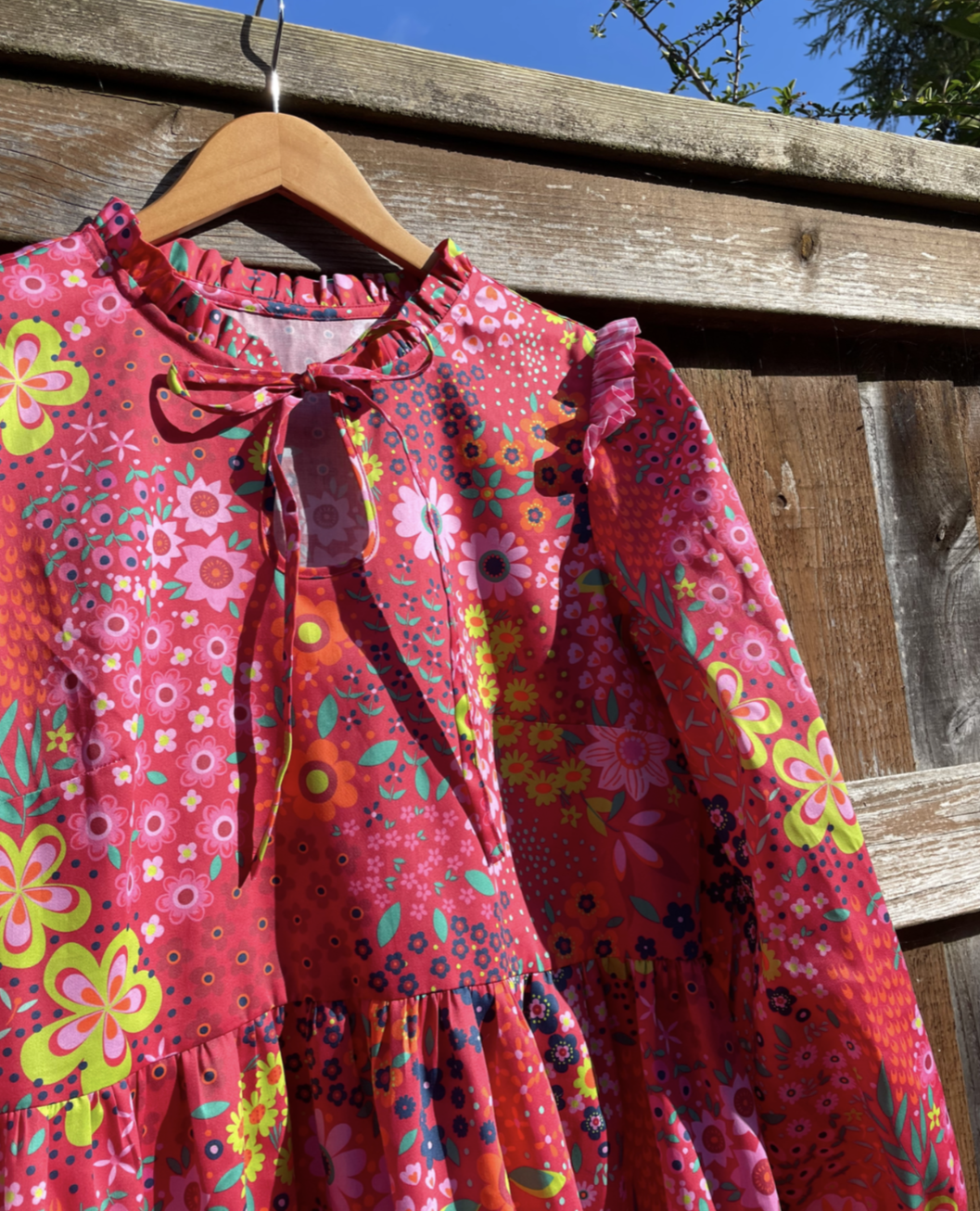 She has full length full voluminous sleeves gathered into a contrast fabric tunnel to create a wrist frill. Full tiered skirt with a contrast gingham frill and side pockets. A a pretty keyhole tie fastening at the front.