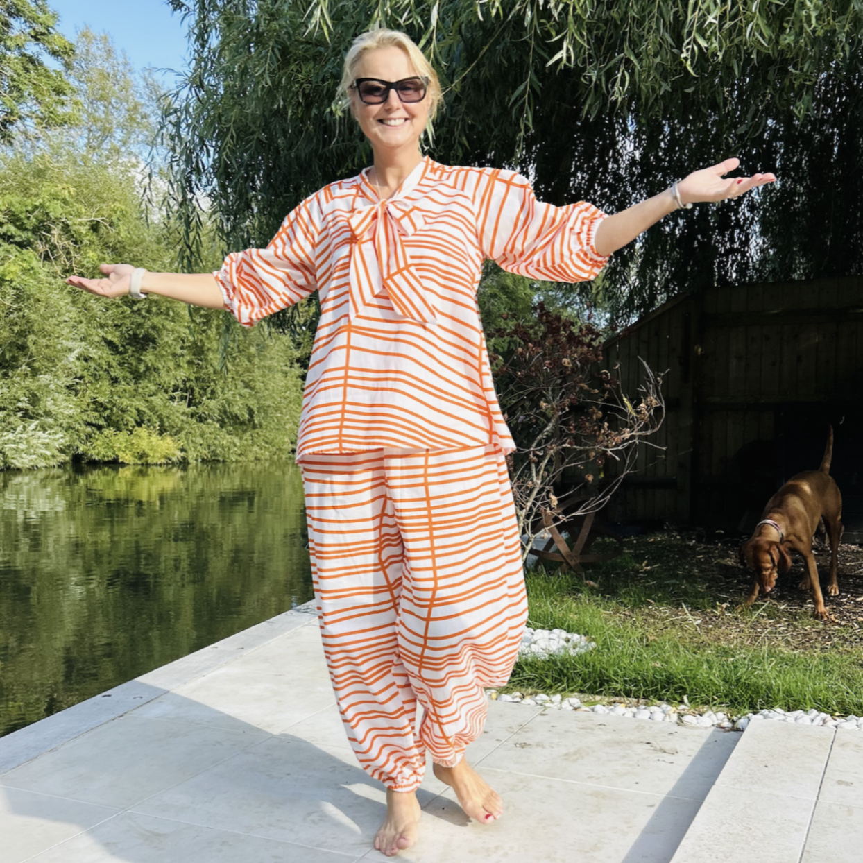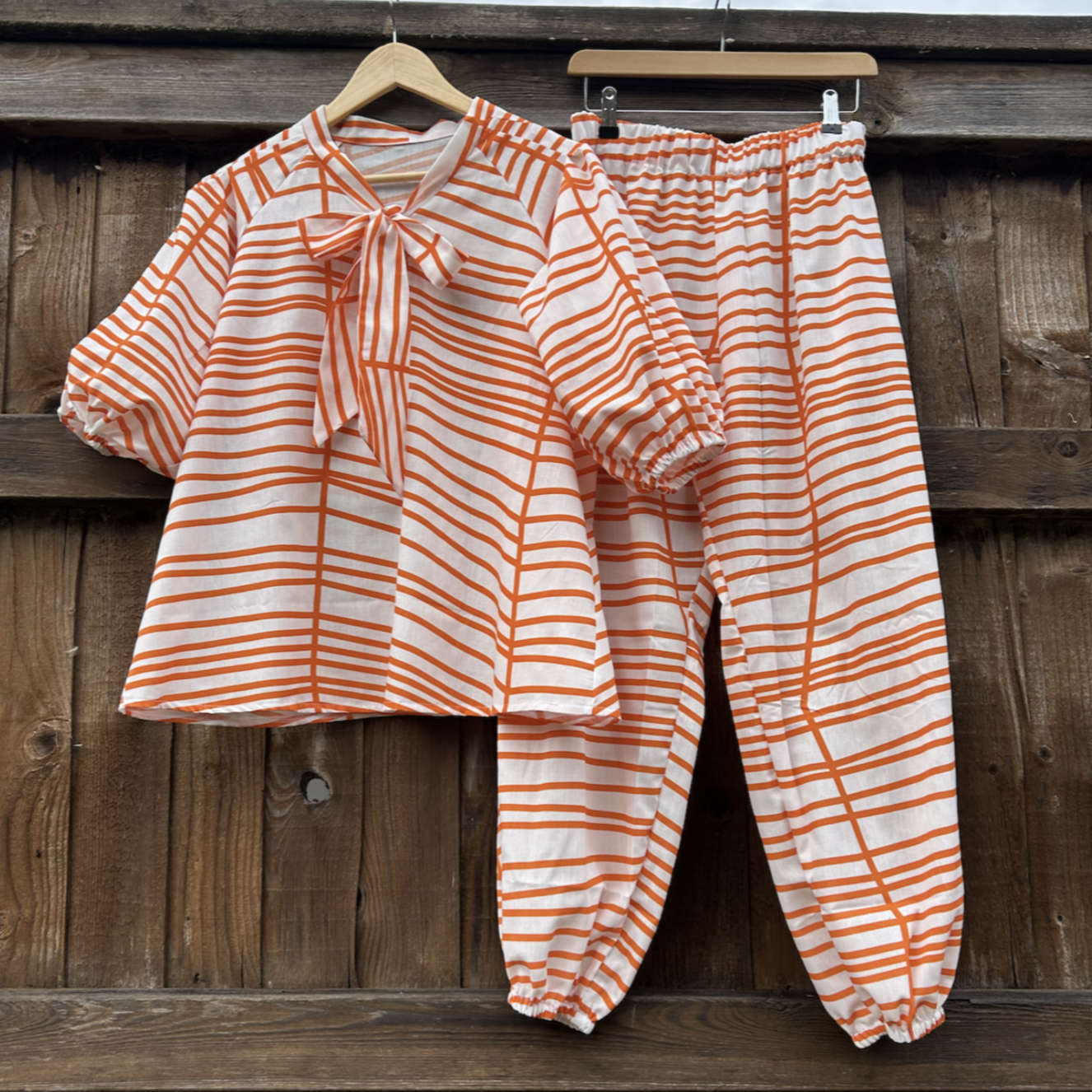 What a fabulous set this is, the top has a pussy bow fastening and elbow length raglan sleeves with pleats at the shoulder to give fullness. The cuffed, baggy trousers have a 4cm deep elastic waistband and inseam side pockets. In the cooler months wear a long sleeve turtle neck top underneath for the extra warmth and stye with high boots - Gorgeous!