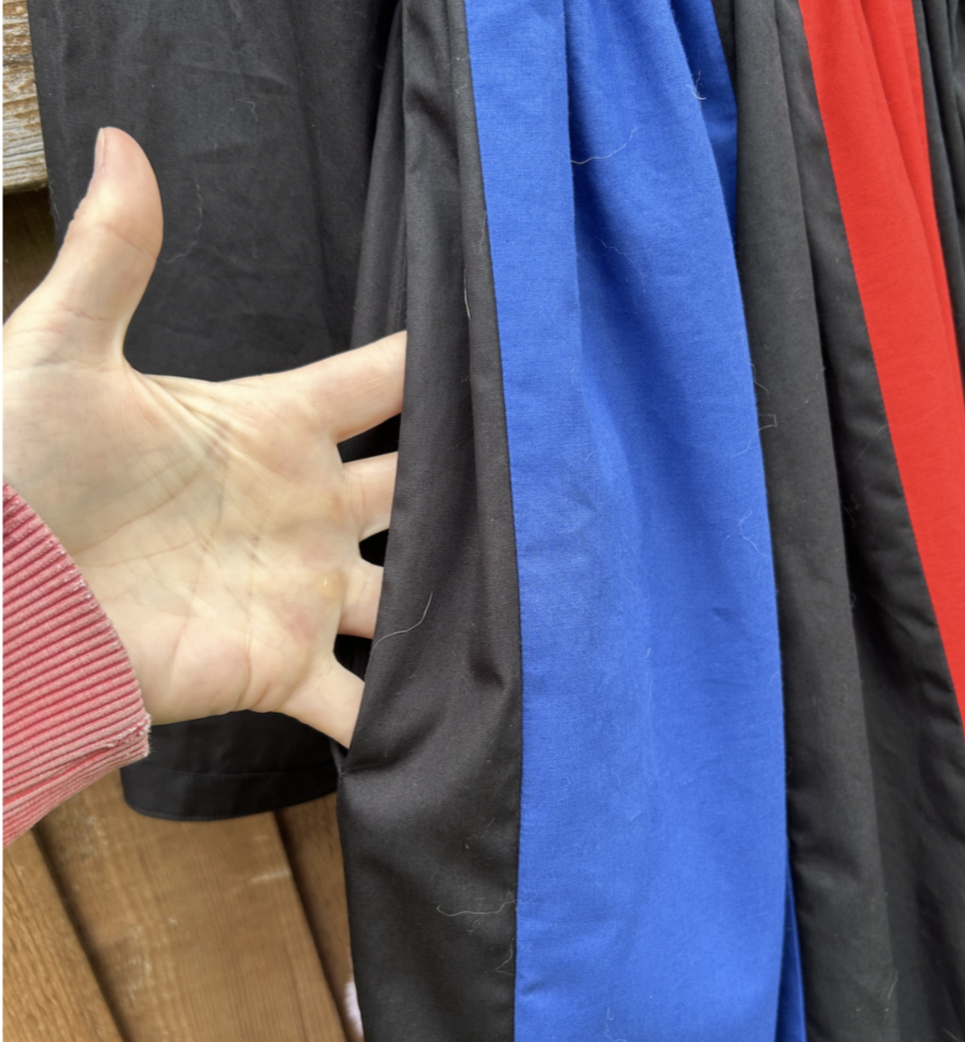 It’s a great dress with a lined semi fitted bodice with back neck opening. Fun coloured panels create a full skirt with side pockets