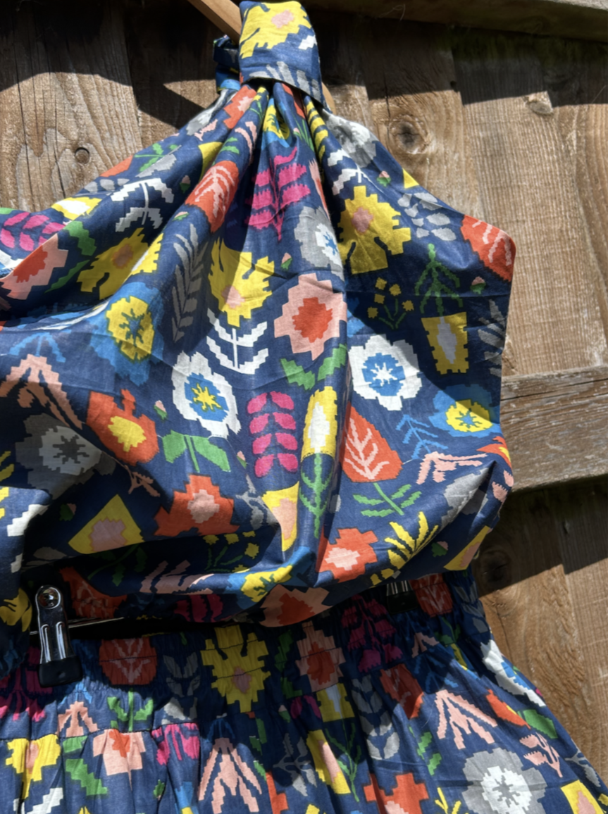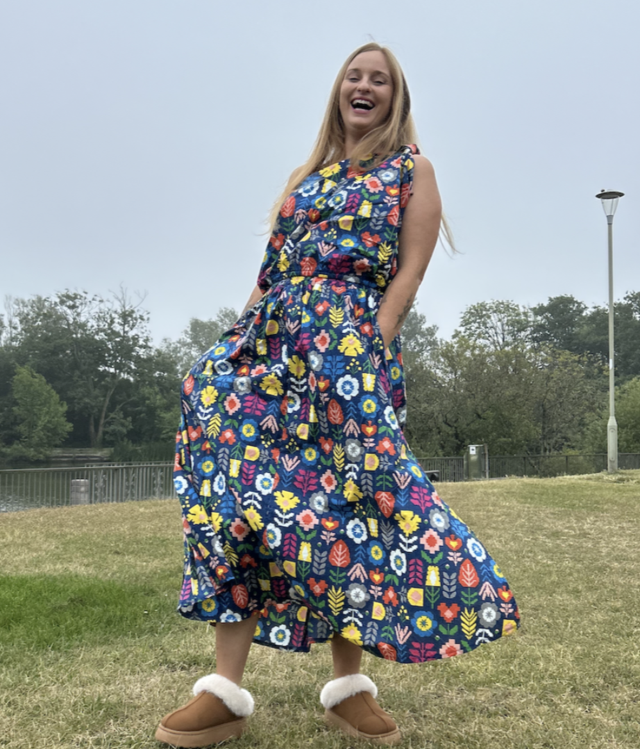 It has a long A-line skirt with side pockets, 4cm elastic waistband and knee high splits at the side seams. The top has a toga feel to it, with an asymmetric twisted shoulder strap, full voluminous bodice gathered into narrow elastic at the waist.