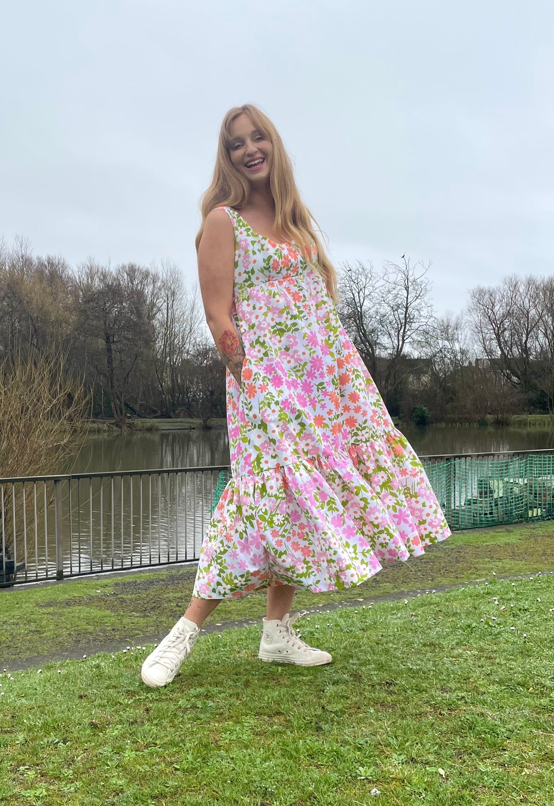 Charlotte has a lined fitted bodice with tight elastication at the back to fit your shape. It is a pull on style, has a full deep frill at he hem and side pockets.