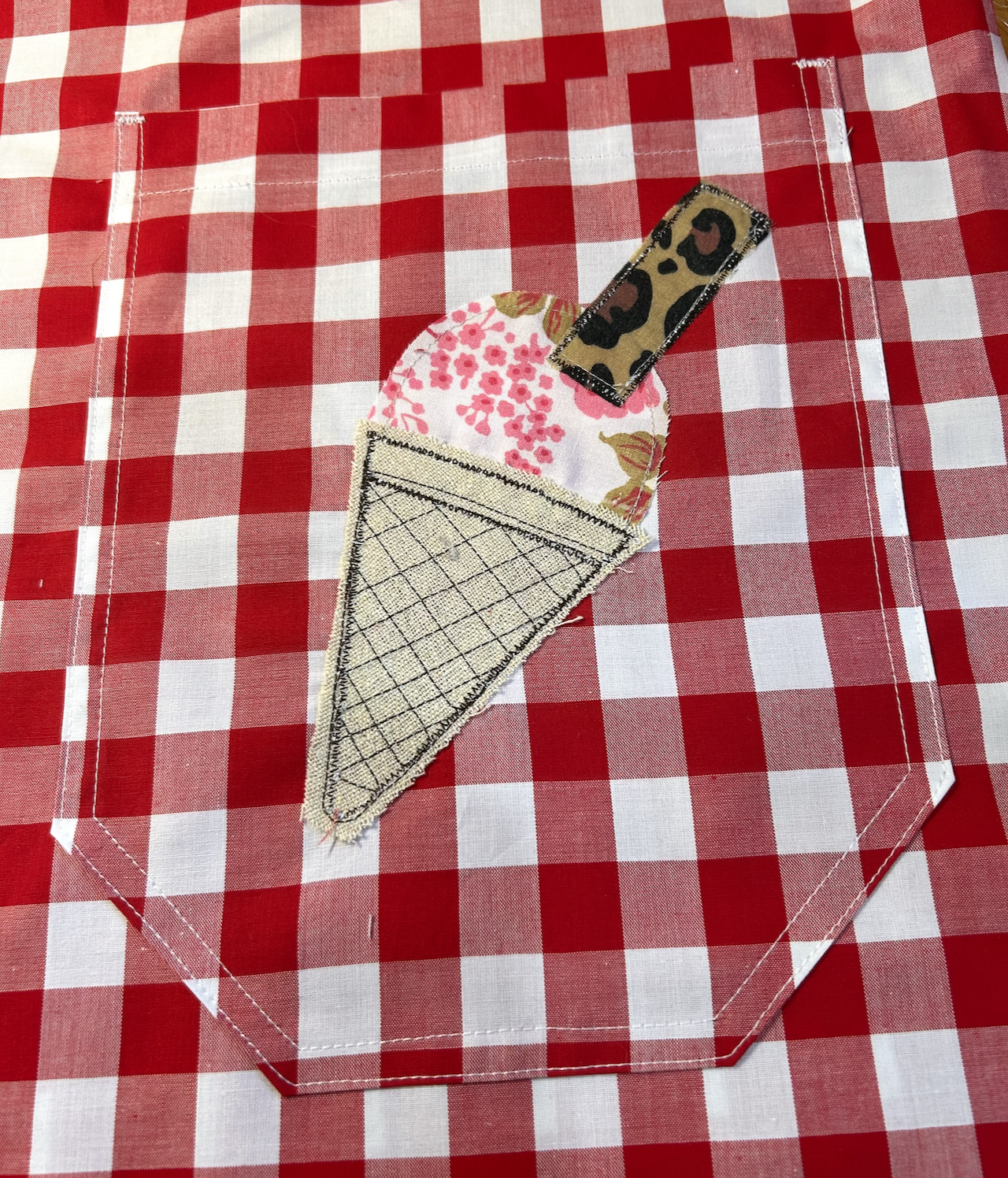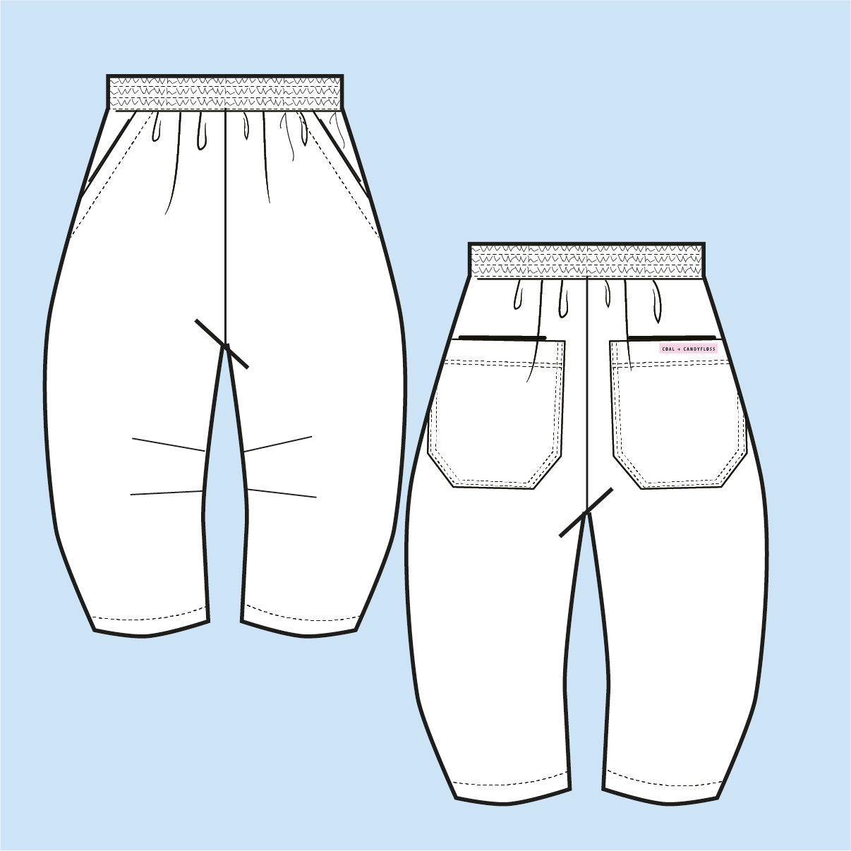 Our Blake style trousers are a great comfy loose fit. They have a subtle banana shape leg which finishes at the ankle, front slash pockets and two oversize back pockets with a fun ice cream fabric application and a contrast satin tape stitched down the side seam. The elasticated waistband is 4cm deep.