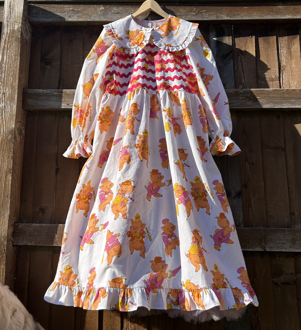 Cynthia is a perfect Spring dress which looks great in all our fabrics. She has a loose fitting bodice with a contrast ric rac detail at the front, large over size frilled collar and big full balloon sleeves gathered into an elastic cuff. Full gathered long skirt with side pockets and contrast frill at the hem. There is a back neck fabric loop and button to secure.