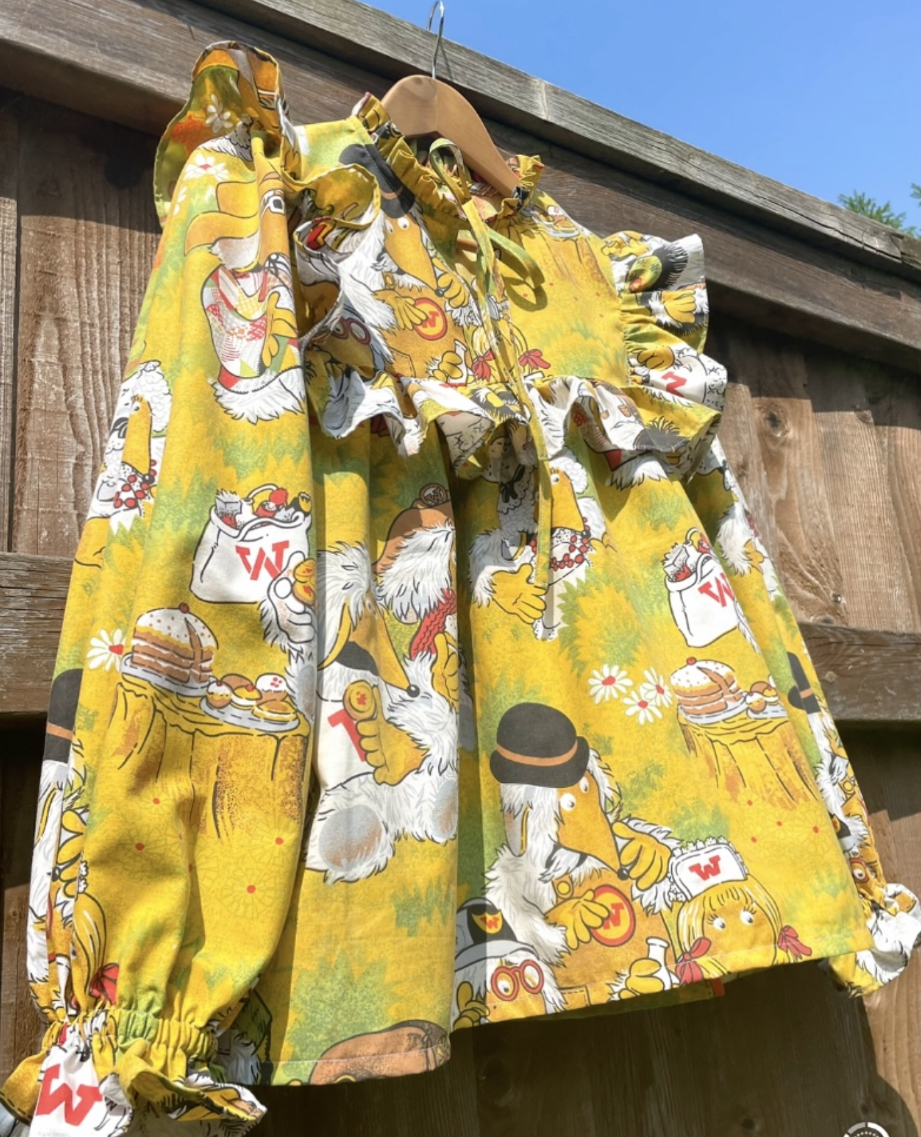 The yoke has a super deep frill at the front and back. The full puff sleeves are full and gathered into an elastic cuff at the wrist.