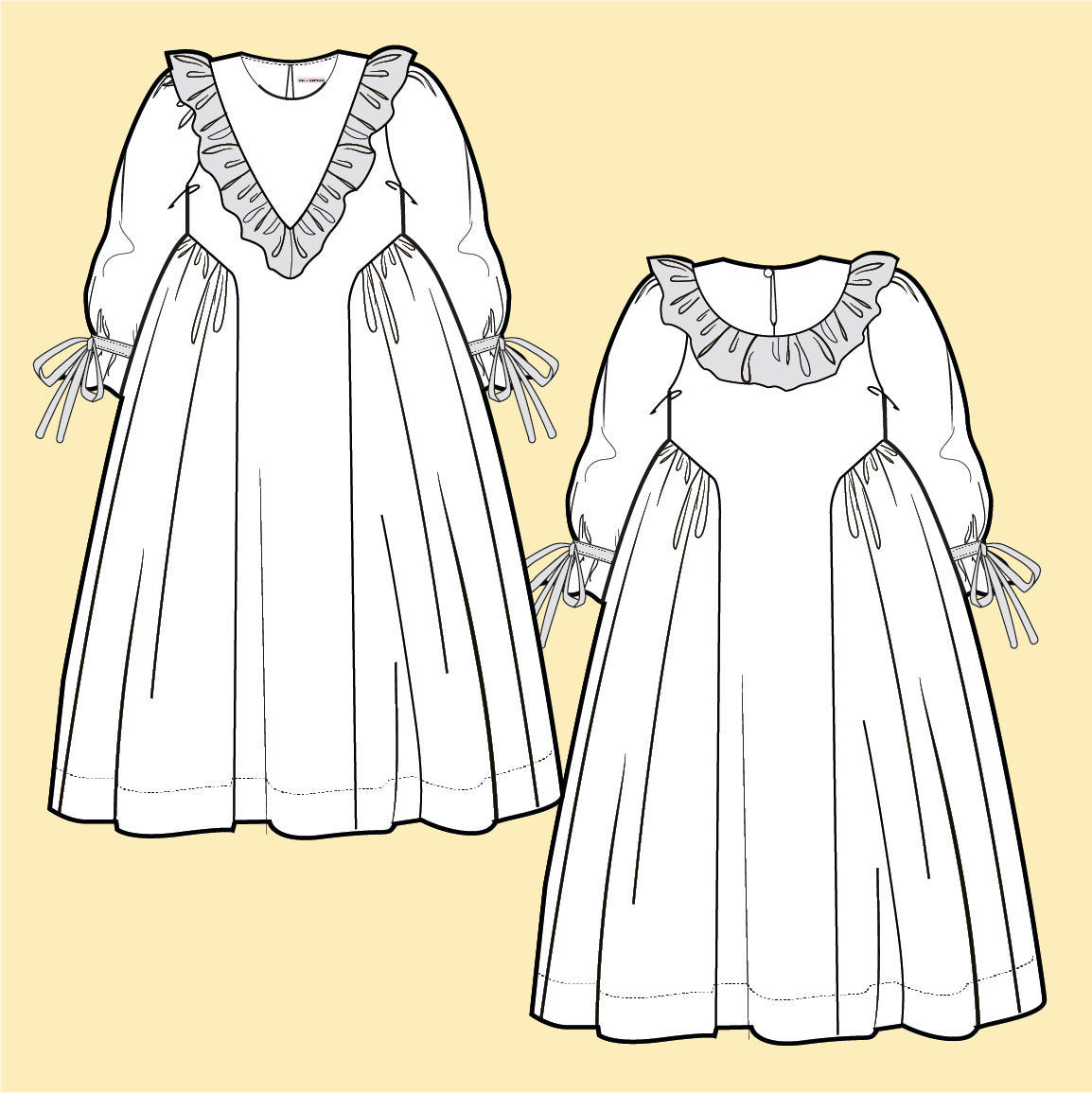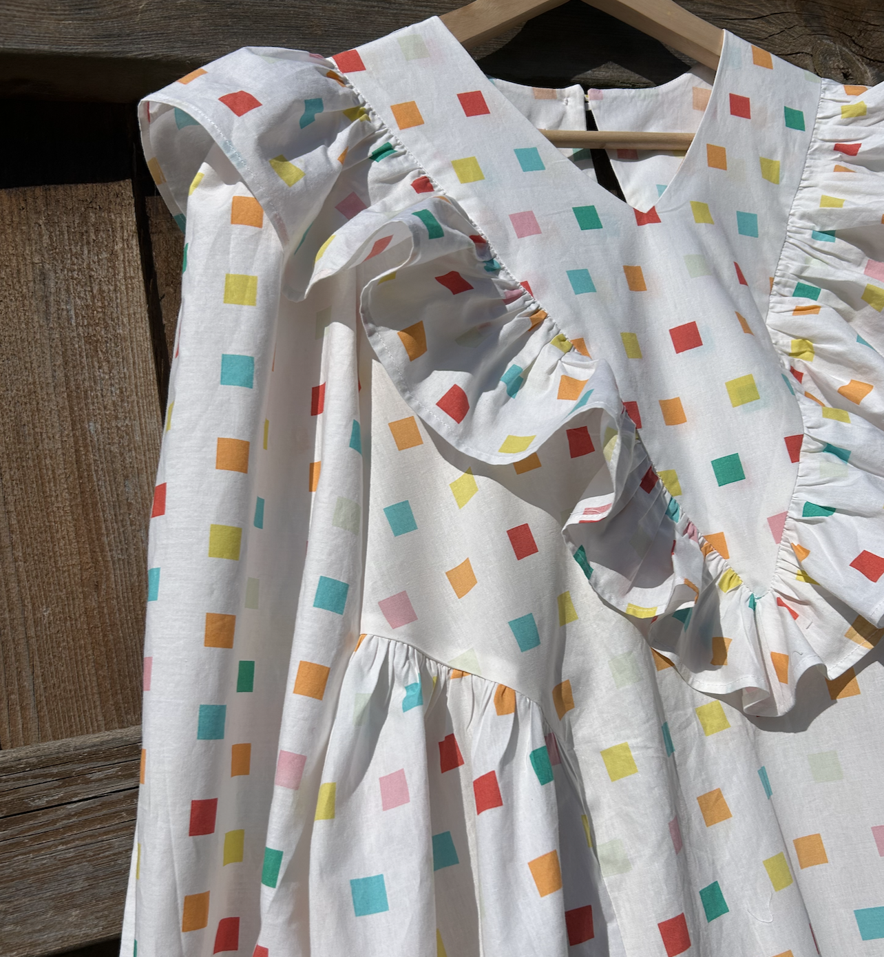 Polly is a gorgeous loose fitting style with a big frilled deep V yoke at the front. She has super full sleeves with an elasticated wrist and tie detail and there are pockets in the side seams.