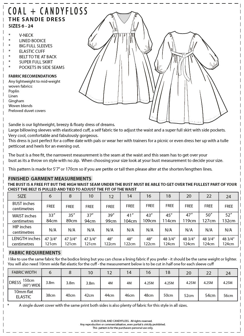 Sandie is our lightweight, breezy & floaty dress of dreams. Large billowing sleeves with elasticated cuff, self fabric ties to adjust the high waist and a super full skirt with side pockets. Very cool, comfortable and fabulously gorgeous.