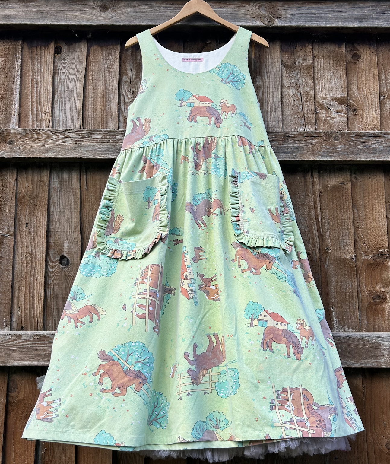 I just love a pinafore dress to layer with a tee or blouse underneath and a cardigan or jacket over the top as it gets cooler. This beauty is made from a gorgeous and rare pony duvet cover, the print and colours are just gorgeous.